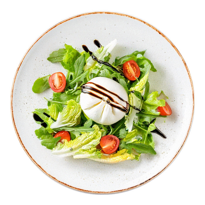 Склад: мікс салатів, сир бурата, томати чері, соус песто